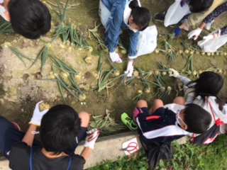 昼食場所から少し歩いて玉ねぎ畑に行きました。係の方のお話をきき、大きな玉ねぎを探しながら収穫しました。