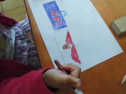 三角の形をした積み木を持った子は,三角の形を写してそこから食べ物を想像してケーキを描いたり,四角の形をした積み木を持った子は,四角の形を写して建物や乗り物などを想像して,学校や新幹線を描いたりしていました。