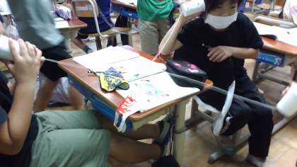 という子どもたち,実際にふるえを確認しながら糸電話で楽しくお話して実験しています。