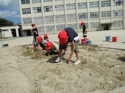 シャボン玉・的あて・すなあそびと地面に水でおえかきの