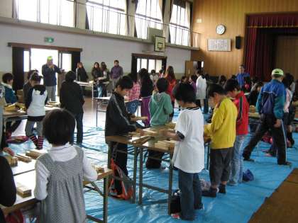 12月3日(土)午前10時から体育館で,ふれあい土曜塾の「木工教室」が行われました。今回は,木でミニチュアの椅子を作ります。体育振興会・自治連合会・PTA役員さんなどが協力して材料の準備から子ども達への指導までしてくださいました。作り始めると,体育館にトントントントンというリズミカルな音が響きわたりました。