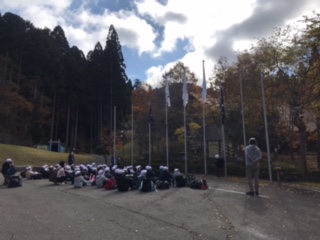 到着してすぐに入所式です。勧修小学校の旗を掲げて、いよいよ山の家での活動開始です。