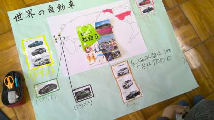 6くみ 世界の自動車生産について 公開日 2023/05/09 更新日 2023/05/09 6くみ 各国の車の生産量について詳しく調べている学習の続きです。 いよいよポスターの完成が近づいてまいりました。 今日は各国の生産台数をまとめ、国旗も描きました。