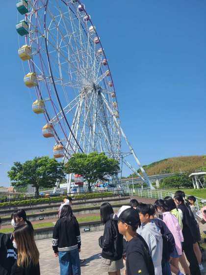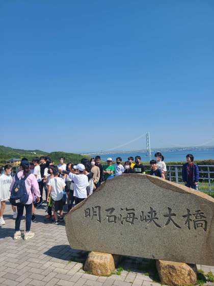 子どもたちを乗せたバスは、予定通り淡路サービスエリアに到着しました。絶好の青空のもと、明石海峡大橋をバックに記念撮影をしました。