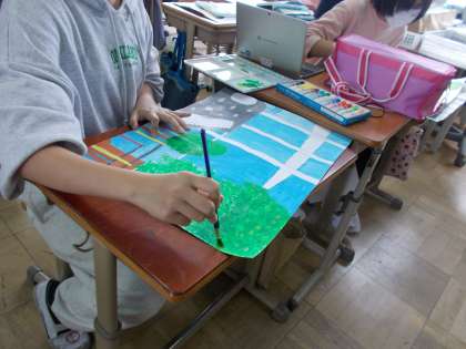 学校内で自分のお気に入りの風景を絵にかいています。絵の具で着色をしているところです。水の量や筆の使い方を工夫して表現しています。仕上がりが楽しみです。