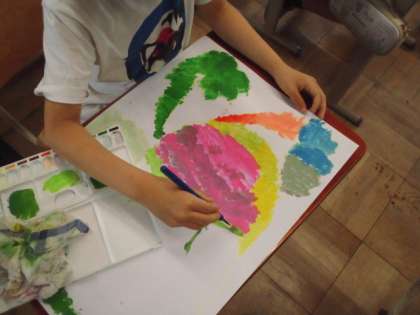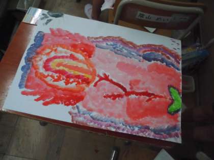 図画工作科では「まぼろしの花」をかきました。「まぼろし」ってどんな意味なんだろう。というところから始め、誰も見たことのない花を想像していました。色や形を工夫し、細部までこだわって作品作りに没頭していました。