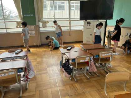 今日はグループで、まきじゃくを使って教室の縦と横の長さや、校庭の木の周りの長さを測りました。