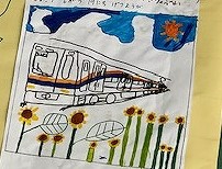 得意の電車の絵に、ひまわりと入道雲の後ろの夏空を描き添えました。