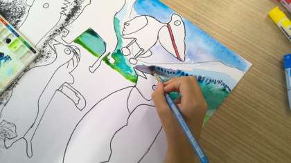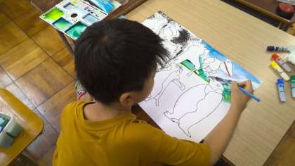 お話の絵の続きに取り組んでいます。今回は「はいけい」を描いています。