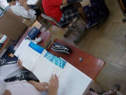 国語科で「やまなし」の学習をしています。宮沢賢治さんの独特な表現の仕方から情景を想像したり、作者の思いを考えたりしています。難しい表現を友だちと、自分はどう感じたかを話し合いながら学習をすすめています。