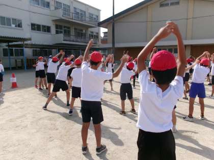 2回目の全校練習でした。まずは体操でウォーミングアップ!秋晴れの空は涼しくて気持ちいいです。