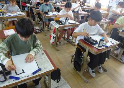 書写の学習で「思いやり」の4文字を書きました。4文字のバランスをとるのが難しかったようです。また、ひらがなの曲がり方やはらいなどに気を付けて、丁寧に仕上げました。