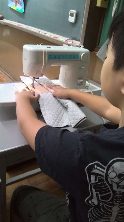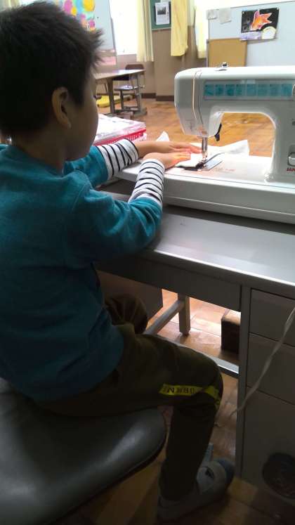 布をミシンで縫い合わせる前に,布がずれないように,手縫いで仮止めをしました。今日は,いよいよミシンを使っての本縫いです。足でスイッチを踏み,ミシンが動くことを確認した後,布を手で少しずつ動かしていきました。「布が進んでいるよ。」「わあ。すごい!」と,ミシンが動くことを楽しんでいました。手作りのナップザックを使う日が待ち遠しいです。