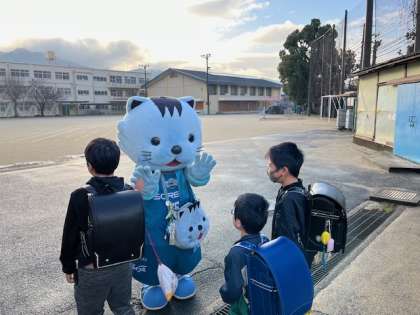 1月25日に引き続き、京都ハンナリーズの“はんニャリン”がやってきました。2年生の児童と一緒にあいさつ運動を行いました。照れている様子の児童もいたり、興味津々でコミュニケーションを図ろうとしたりする児童も見られました。