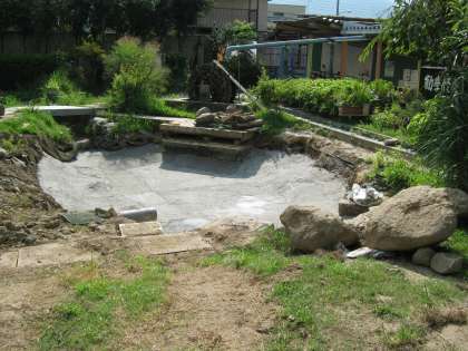 水漏れがひどいので,先週の学校閉鎖日からビオトープの工事をしています。工事前には,ビオトープで生息するメダカ・カエル・おたまじゃくし・ヤゴ・タニシなどの生き物を救出するために,校長・教頭・管理用務員・給食調理員などが網を手に追いかけまわして捕獲しました。工事終了後に生き物を元に戻す予定です。
