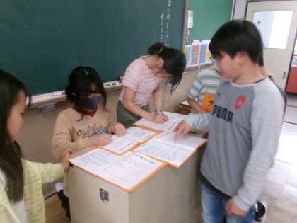 修学旅行のしおりを配布しました。班ごとに確認をして、めあてを考えています。