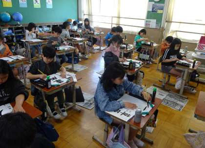 5年生になって初めての書写。初めに筆の持ち方や座り方などを確認したあと、「草原」を書きました。静かな空気でとても集中して書くことができました。
