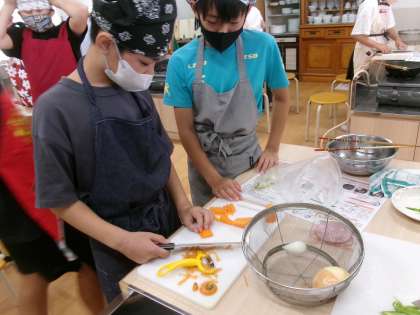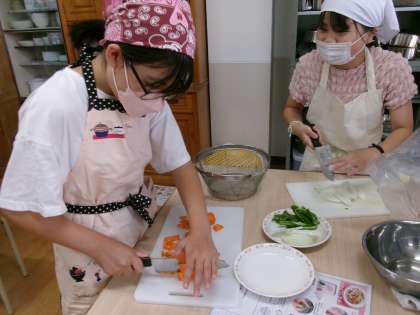 栄養教諭の先生にもアドバイスをもらい、野菜を切っていました。慎重に包丁を使っていました。