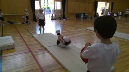 マット遊びをがんばっています。坂の場、広い場など自分で場を選び、何度も何度も練習をしている姿が見られました。また、友達同士で見合ってアドバイスをし、みんなで仲良く安全に活動することができていて、本当に素晴らしいです!
