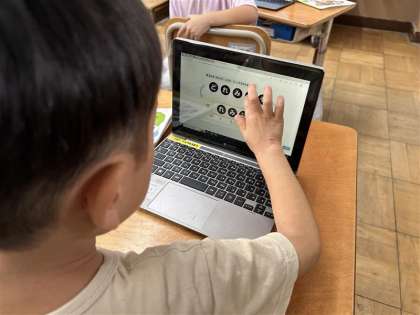 音楽の学習で、旋律のよびかけっこをしました。タブレットで旋律を作り、ペアの友達と作った旋律をまねっこしたり、つなげたりしました。楽しく呼びかけ合うような旋律になるようにいろいろな組み合わせを試して、最後には発表をしました。