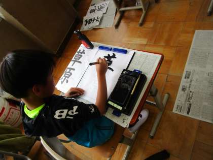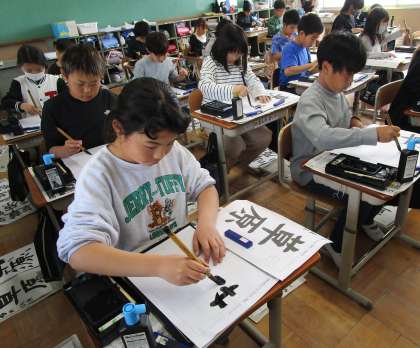 5年生初めての書写。点画の組み立て方に気を付けて、自分で決めためあてに向かって真剣に練習する姿が見られました。