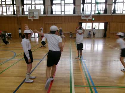 体育の時間にバナナ鬼を楽しみました。タッチをされて片手を下げる瞬間の安堵感を感じる表情が面白かったです。