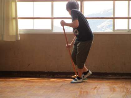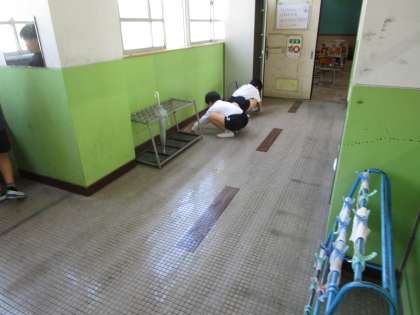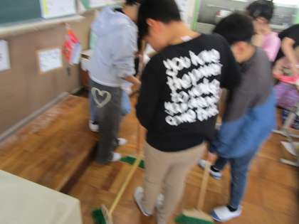 背中で語る5年生。そうじの時間、5年生は汚れを見つけ全力です!社会科の片付けの時間、何も言わなくてもほうきを用意する仲間!かっこいい背中です!
