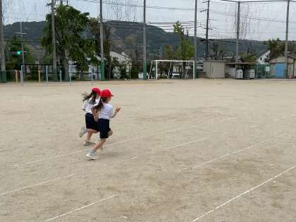 体育で50m走を走りました。最後まで一生懸命走る姿が見られました。2回目はくたくたになりながら走っていました。
