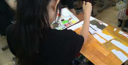 絵の具で色を塗るときも、実物の色をつくることにこだわって色をつくり、丁寧に色付けしています。
