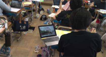 図工では、学校の中の思いでの場所を描いています。