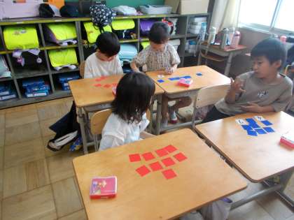 算数「いくつといくつ」の学習で、数カードを使って2枚で10を目指すカードゲームをしました。隣の席の友達とどちらが多く10のペアを作れるか競いました。ゲームを通して、いくつといくつで10になるかを楽しみながら考えました。