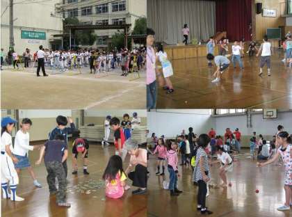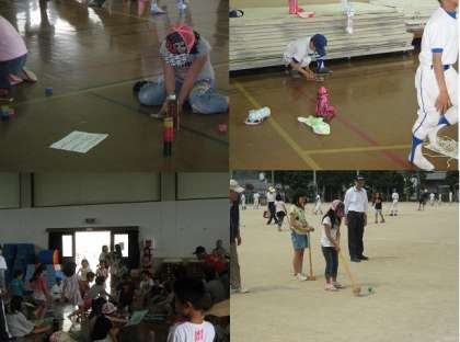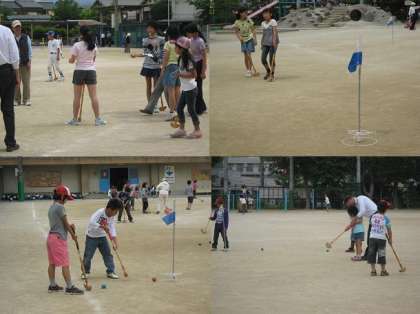 今回は,社会福祉協議会主催,PTAとおやじの会共催で,「グランドゴルフ教室&むかしの遊び」をおこないました。100名以上の子どもたちが,体育館と運動場に分かれて,グランドゴルフとむかしの遊びを地域の方々に教えていただきました。