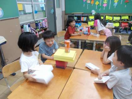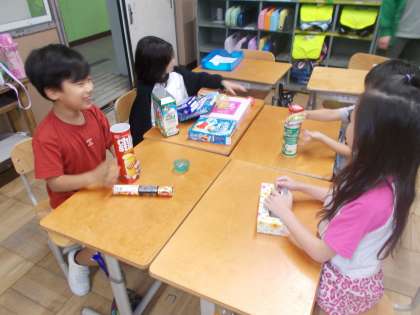 算数「いろいろなかたち」の学習で、様々な形の箱の特徴をいかして動物を作りました。四角い形の箱や筒形、まるい球のような形をうまく使い分けてグループの友達とつくりました。それぞれの形の特徴を整理して、転がるもの・積み上げられるものなど理解できるように学習を進めます。