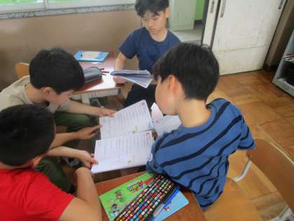 明日はテスト!復習の時間は、教え合いタイムです。みんなで全力で臨む姿が素敵です。