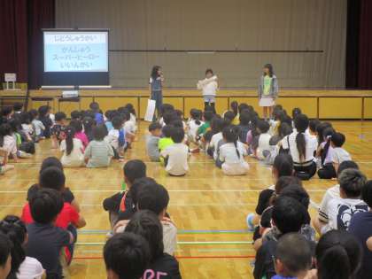 児童集会では、勧修スーパーヒーロー委員会(代表委員会)から児童会目標や朝活の名前、勧修のキャラクターについて話がありました。みんなの願いをかなえる学校、そしてみんなの笑顔があふれる学校に向けて高学年からがんばろう!