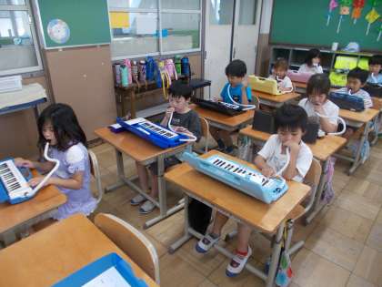 この日は鍵盤ハーモニカで「ド」と「ソ」の位置を確かめました。黒鍵の位置から「ド・ソ」の場所を見つけ、どんな音なのか弾いてみました。たくさん練習し、曲を演奏できるようになるのが楽しみです。