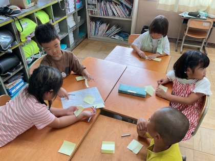 いきものと仲良くなるためにまず、学校の中のどこにどんな生き物がいるかを考えました。グループのみんなで考えながら、いそうなところに付箋をたくさん貼っていました。