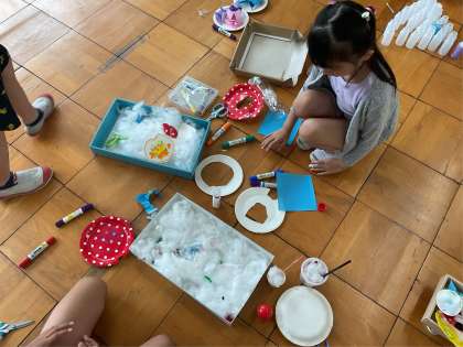 UFOキャッチャーやロケット,お祭り屋台のお店などを作って,友だちとグループになり,時間いっぱい楽しく遊んでいます。