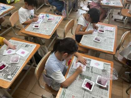 生活の時間にアサガオを使っていろみずの学習をしました。自分でいろみずを作り、好きな絵を描いていました。