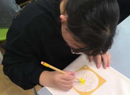 今日は京友禅の方々に来ていただき、染め物体験をさせていただきました。金箔で縁どられた型にお気に入りの色を付け、染めることができました。中には、複数の色を塗り重ねグラデーションにしている人もいて美しく仕上げました。世界に一つだけのトートバッグができ、本当に貴重な体験をさせていただきました。
