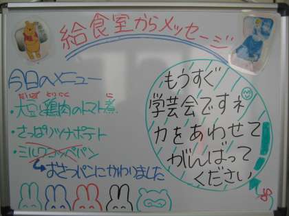 11月6日(火)−雨が上がりました。 公開日 2012/11/06 更新日 2012/11/06 今日の給食 雨が上がりましたね。中間やすみには運動場が使えませんでしたが,この分なら昼休みには遊べると思います。学芸会が近づいてきました。練習に余念がないところですが,少しずつ疲れもたまってきているのかもしれません。風邪欠も増えてますので,体調管理をよろしくお願いします。