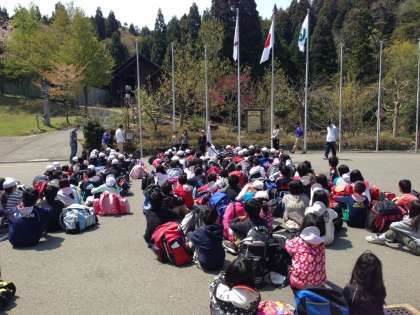 校歌を歌います。そして,山の家の先生の話を聞きます。代表の挨拶や校長先生の話があります。今回は,勧修小学校だけが山の家を使用しています。この後,お弁当を食べました。いよいよ,活動開始です。