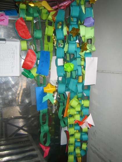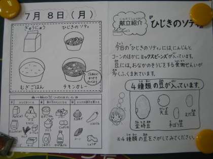 気象庁が8日午前に九州南部・北部、四国、中国、近畿、東海地方が梅雨明けしたとみられると発表したそうです。これは例年より13日も早く,昨年と比べても8日早いそうです。京都の梅雨明けは,いつも祇園祭の頃ですので,いかに早いかがわかりますね。今日の3枚目の写真は,給食ホールに飾ってある笹飾りです。お願いはかなうでしょう?