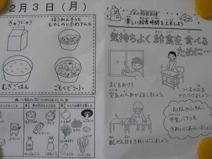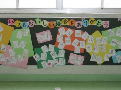 2月3日(月)−今日は節分です。 公開日 2014/02/03 更新日 2014/02/03 今日の給食 今日は節分です。明日が立春です。暦の上では,いよいよ春です。ちなみに,節分というのは,文字通り,季節の変わり目のことで,年4回あるそうです。豆をまくのは,この春の節分だけだそうですが。(テレビからの情報です) 給食週間は,先週で終わりましたが,給食委員の掲示物の紹介を続けます。今日の3枚目の写真は,北校舎西階段の踊り場の掲示物です。