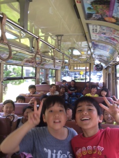山の家に向けて出発して1時間がたちました。バスの中は、とてもにぎやかです。しおりを見て、これからの活動をチェックしている人もいます。見通しをもつことは、とても大切ですね。