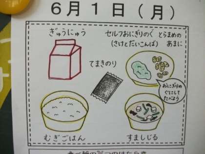 今日の給食は,「セルフおにぎりのぐ(鮭と大根葉)」「とらまめの甘煮」「てまきのり」「すまし汁」「むぎごはん」「牛乳」です。手まきのりで,ご飯と具をまいて食べました。