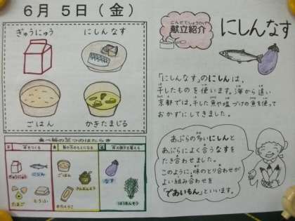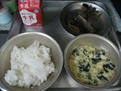 今日の給食は,「にしんなす」「かきたまじる」「牛乳」「ごはん」でした。