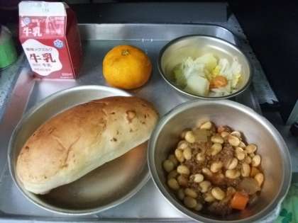 今日の給食は,「やさいのホットマリネ」「チリコンカーン」「みかん」「チーズコッペパン」「牛乳」でした。