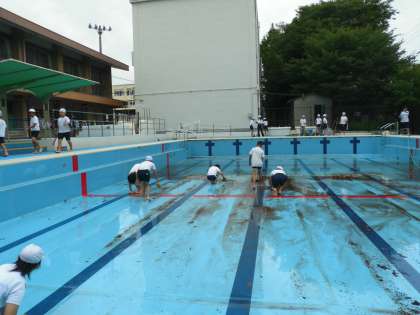 6年生 プール清掃 公開日 2015/06/10 更新日 2015/06/10 6年生 今月から始まる水泳学習に向けて,6月5日に6年生がプール清掃を行いました。 朝から気温の低い中,水を抜いたプールの底や壁面をスポンジなどを使ってこすり,汚れを落としました。 3クラスが順番に清掃を終えた時には元のピカピカのプールになり,学校の代表として水泳学習の準備をととのえることができました。