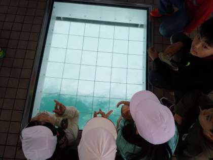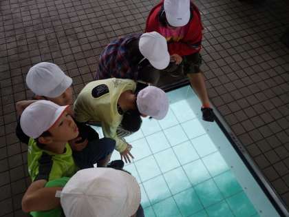 修学旅行 1日目(渦の道) 公開日 2015/06/11 更新日 2015/06/11 6年生 観潮船を降りて、次は渦潮を上から観られる『うずの道』の見学をしています。 床にガラスの部分があり、海が見えます。